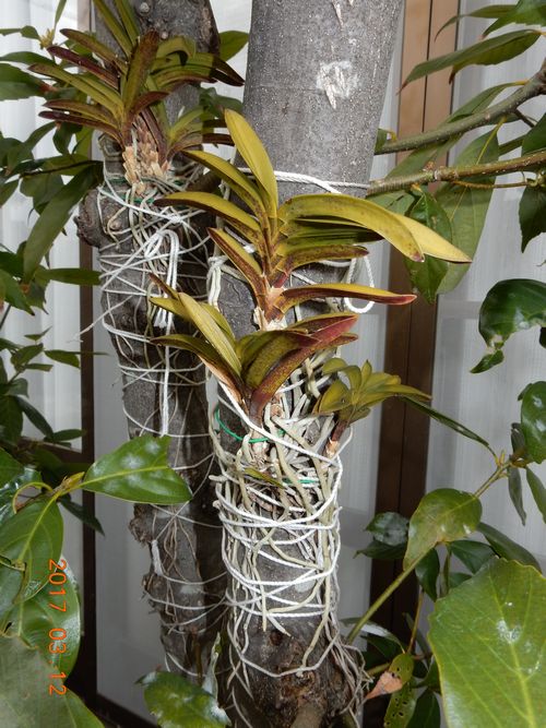庭木着けフウランはいずれもひん死の状態に見えますが、自然の中にあるフウランは冬季を仮死状態で過ごしていることを思えば、野生を呼び覚ましたという感じでしょうか。