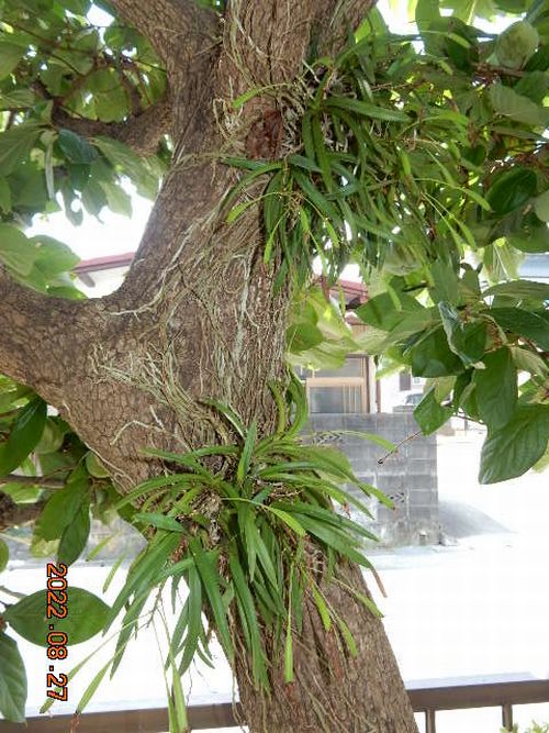 台風の塩害を受けた時、カキの木は葉が茂っていたことと、風蘭が幹の北側に着けてあったことが幸運だったかも知れません。