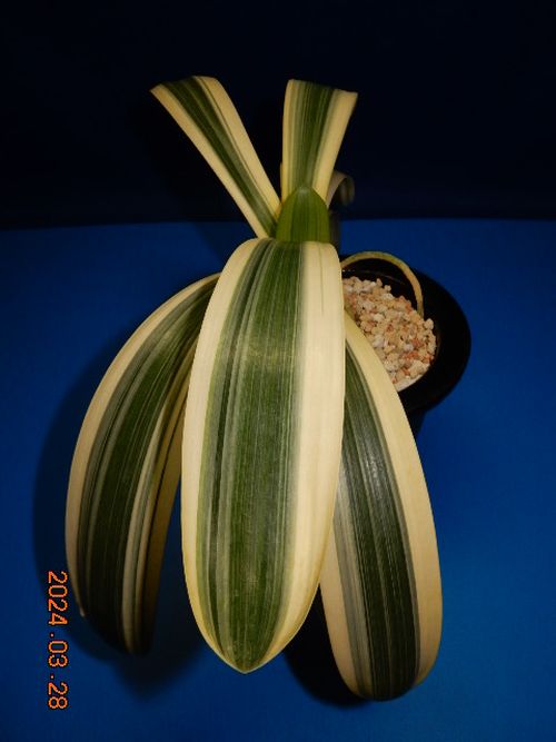 写真の株は2〜3枚の葉に白みの強い細糸縞が混じります。