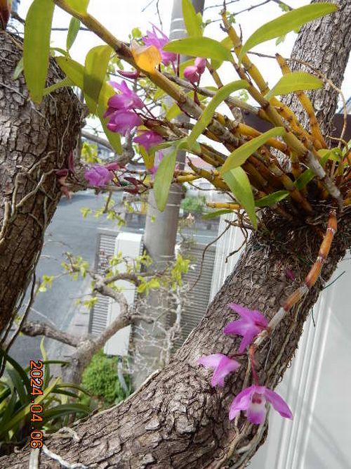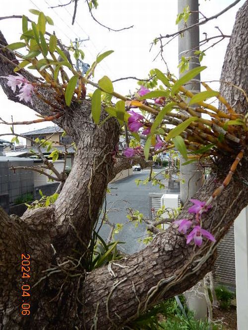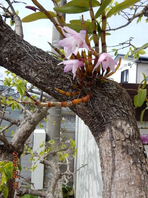 自宅道路沿いの柿の木に着けたセッコク交配種です。